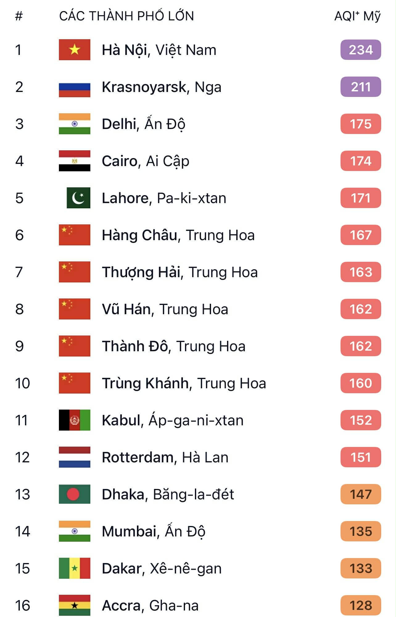 Hà Nội chính thức vượt Krasnoyarsk, Delhi, Cairo để đứng đầu bảng xếp hạng các Thành phố ô nhiễm không khí nhất thế giới theo AirVisual (IQAir) với chỉ số IQA lúc 16h chiều 5/2 chạm mốc 234 – mức Rất Có Hại Cho Sức Khỏe - với nồng độ PM2.5 là 158µg/m3.